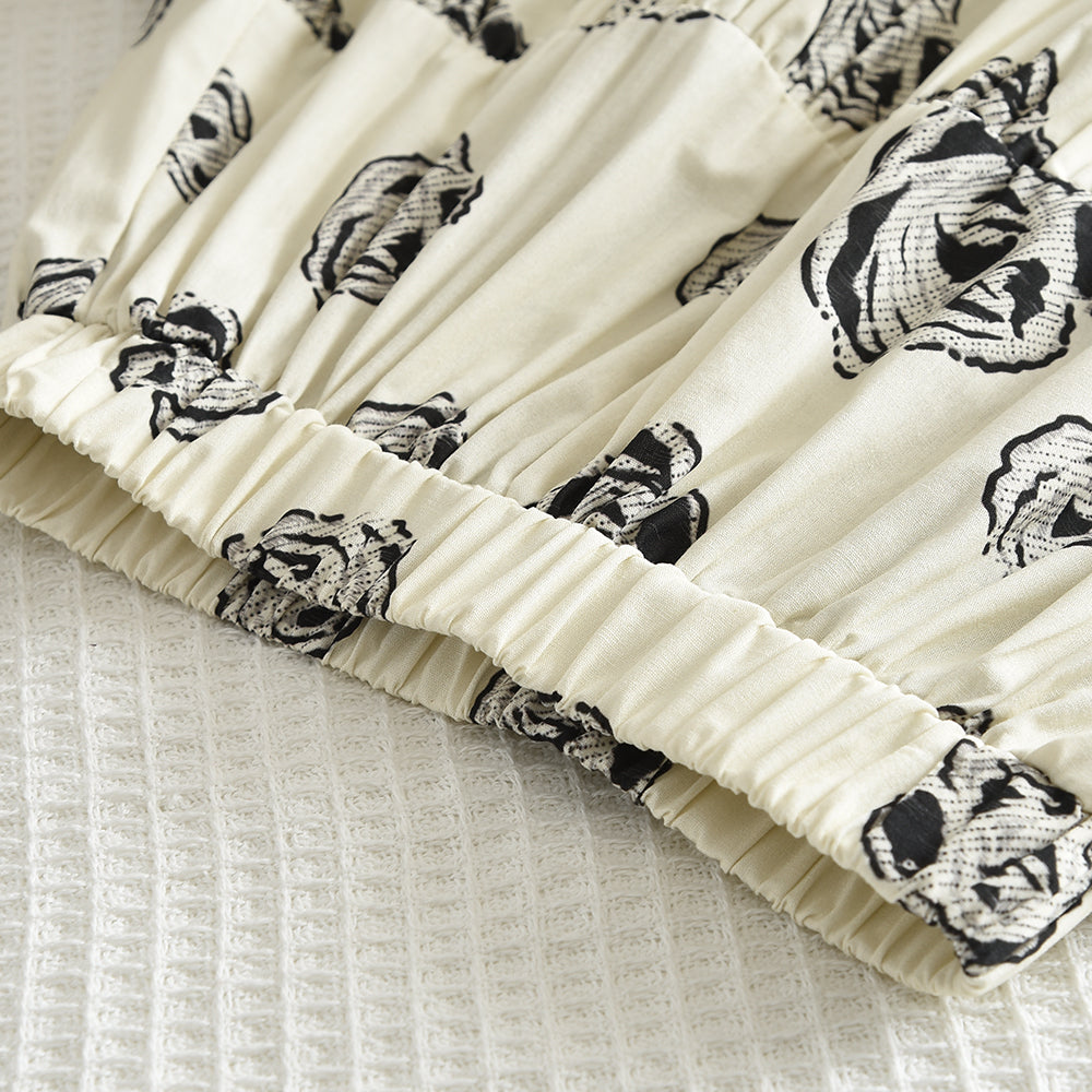 Détails : imprimé nœud papillon, col poupée, bouton, coton